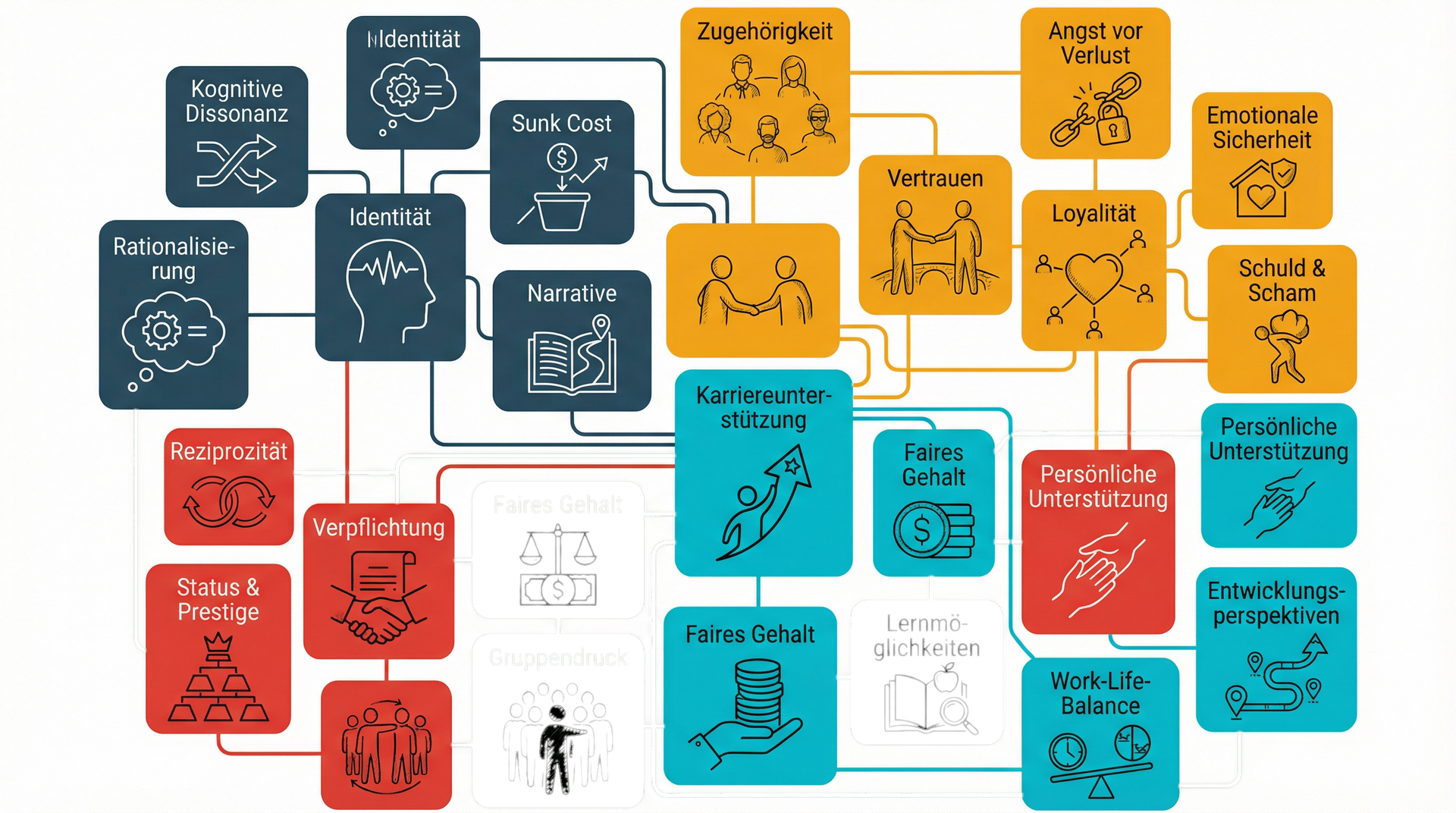 Die kognitive Facette (Dunkles Teal) zeigt die mentalen Prozesse: Identität, Kognitive Dissonanz, Rationalisierung, Sunk Cost und Narrative.