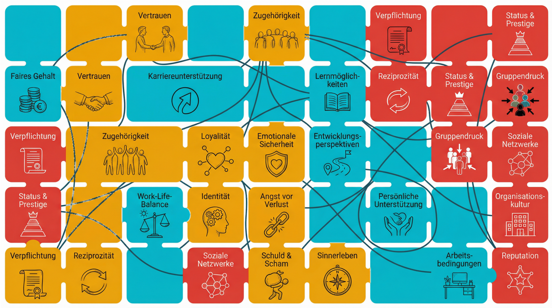 Die Abbildung nachstehend zeigt ein organisch-vernetztes Bindungs-Mosaik indem alle Kacheln, die sog. Bindungskräfte, miteinander verwoben und über die Kategorien hinweg verbunden sind. Die dunklen Verbindungslinien zeigen die gegenseitige Beeinflussung über alle Kategorien hinweg: Wie Faires Gehalt (rational/kognitiv) Vertrauen (emotional) stärkt, wie Karriereunterstützung (rational/kognitiv) die Identität (emotional) prägt, wie Zugehörigkeit (emotional) durch soziale Netzwerke (sozial) verstärkt wird, oder wie die Organisationskultur (sozial) die Arbeitsbedingungen (rational) beeinflusst, oder Status & Prestige (sozial) sogar zur Loyalitätsfalle (emotional) werden kann.