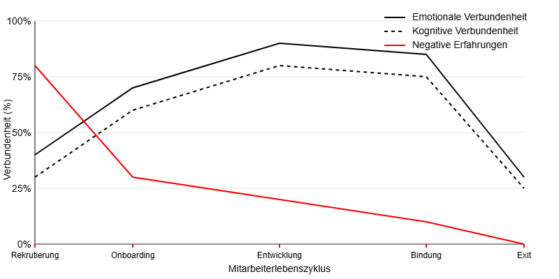 Wenn diese drei Elemente erfüllt sind, entsteht ein starkes rationales Fundament. Die Arbeit ergibt Sinn, fühlt sich bewältigbar an und ist klar strukturiert. Im Folgenden wird das aufbauende Modell der emotionalen und kognitiven Verbundenheit aus meinem Fachbuch Wettbewerbsvorteil Mitarbeiterbindung (Haufe, 2025, S. 41) näher erläutert. Die Darstellung zeigt wie die beiden Dimensionen emotionale und kognitive Verbundenheit in jeder Phase des Mitarbeiterlebenszyklus untrennbar miteinander verwoben sind und welche negativen Auswirkungen, negative Erfahrungen haben.