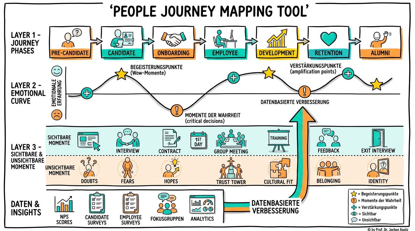Erfahre im zweiten Teil alles über meine abgeschlossene Meta-Studie zur People Experience. Der EX Kompass analysiert über 200 Veröffentlichungen der Jahre 2014 bis 2024. Im Fokus steht nunmehr die durchgehende Journey und die positive Gestaltung der Erfahrungen der Mitarbeitenden in allen Kontaktpunkten. Aus der Studie wurde ein konkretes Instrument für die Praxis erarbeitet: Das People Journey Mapping Tool.