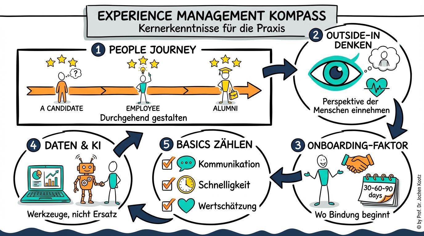Die Mensch-Mensch-Beziehung gilt auch in Zukunft als Hebel zur Differenzierung und nachhaltigen Bindung. Nicht die Maschine wählt aus und bindet, sie unterstützt hybrid-assistierend, vor dem Hintergrund, dass der menschliche Kontakt, so das Credo vieler Autoren, das zentrale Element bleibt. Candidate Experience Management (CXM) wird zunehmend als strategischer Ansatz erkannt, jedoch ist es in der Praxis oft noch nicht vollständig etabliert. Viele Unternehmen fokussieren sich auf die Optimierung einzelner Prozesse oder Touchpoints in der Candidate Journey. Der strategische, langfristige Ansatz, der alle Phasen im Sinne einer durchgehenden People Journey konsistent umfasst, wird häufig noch nicht systematisch umgesetzt. Die Candidate Experience wird oft als Bestandteil des Employer Branding verstanden, wobei die Priorität darauf liegt, die Arbeitgebermarke attraktiv zu präsentieren, jedoch weniger auf einer durchgängigen Beziehungsgestaltung, welches der Kerngedanke des EX ist. Die Analyse der Veröffentlichungen kristallisiert folgende Empfehlungen für ein strategisches CXM heraus, dessen Grundannahmen auch auf die People Journey übertragbar sind: