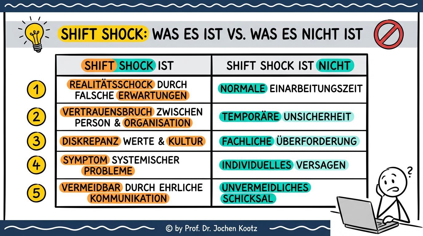 Shift Shock ist letztlich ein Indikator dafür, dass die Organisation ihre eigenen Versprechen nicht kennt oder nicht halten kann. Es ist oftt ein Organisationsproblem, keine Mitarbeitendenfrage. Die Lösung liegt also nicht in besseren Onboarding-Checklisten, sondern in einer ehrlichen Auseinandersetzung mit der eigenen Kultur und ihrer authentischen Vermittlung von Anfang an.